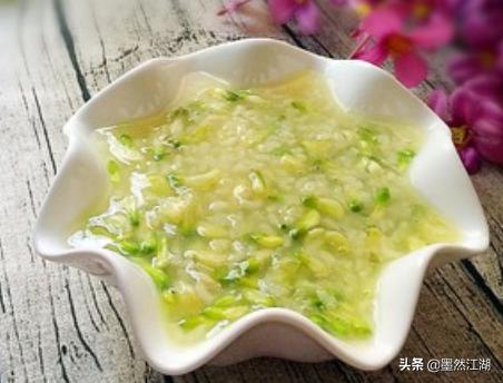 2、煮槐花糯米粥,糯米洗净,放入砂锅中,加水大火煮沸后改小火煮。煮至米烂后,加入槐花,小火煨煮至沸,即成。