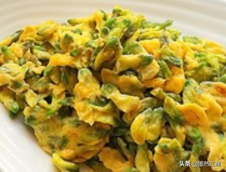 3、炒槐花炒鸡蛋,鸡蛋加盐打散槐花和蛋液拌匀炒锅热油,倒入搅好的槐花蛋液,用筷子快速滑散即可。
