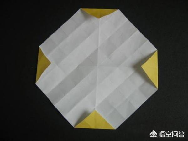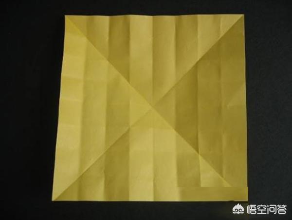 5、步骤五:然后再沿一条对角线对折,折好后再找到对角线上方最近的那条由横向、纵向折痕交叉点连成的线,向上折起。