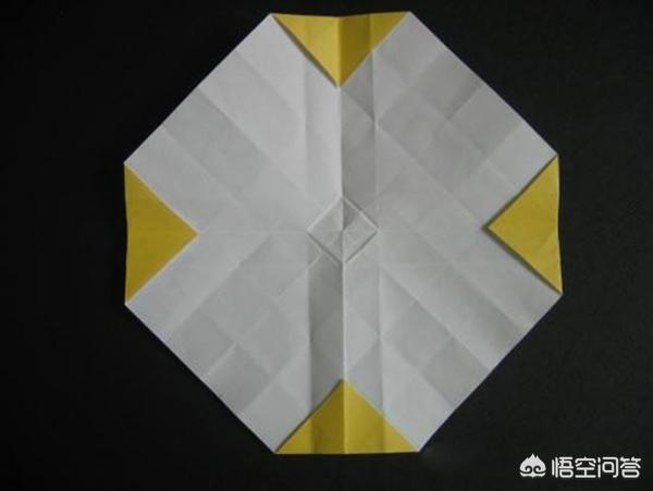 9、步骤九:然后将纸翻转过来,将4条对角线捏起,上图是俯视看到的效果。