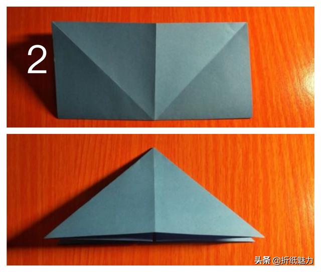 1、首先准备正方形的彩纸,按对角折和对折的方法折好。