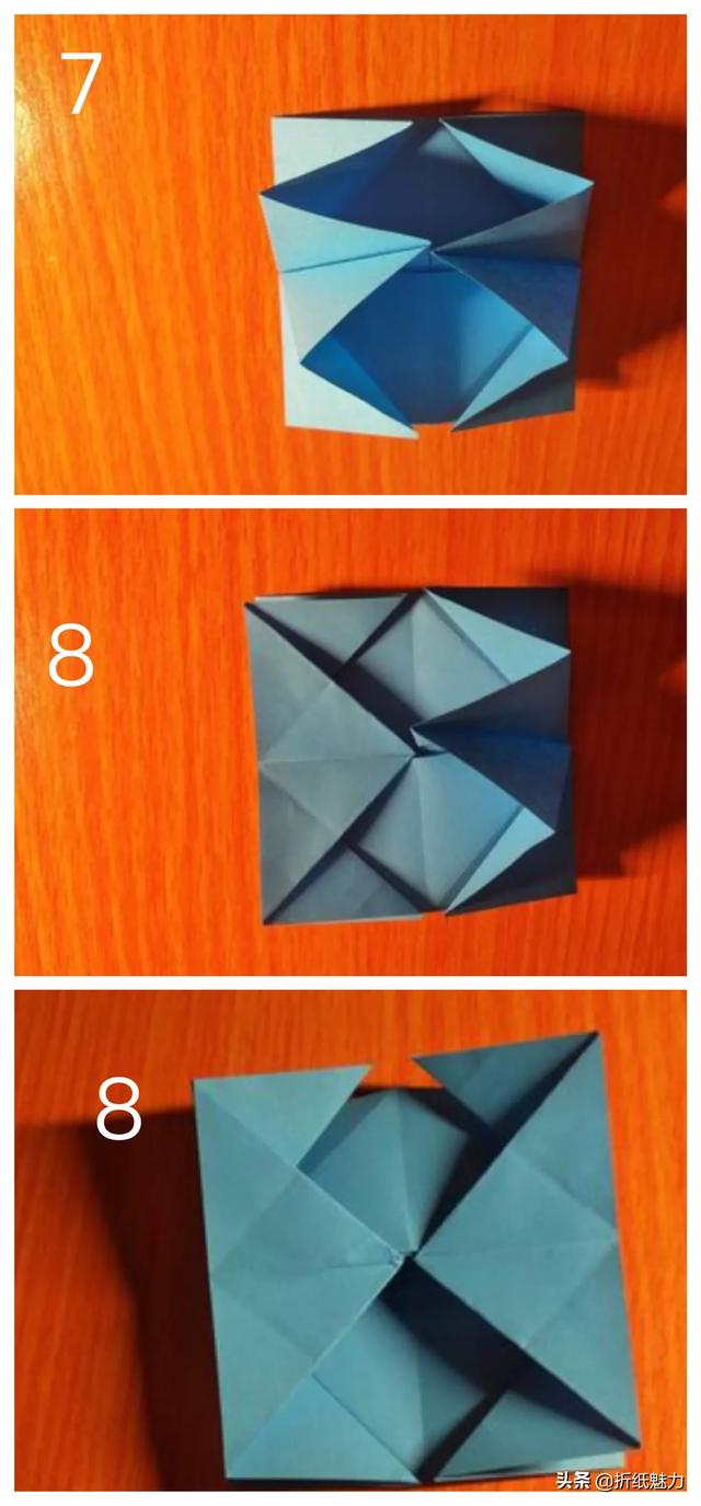 9.将三角形撑开,共四条边,每条边按已有折痕顺时针按压,