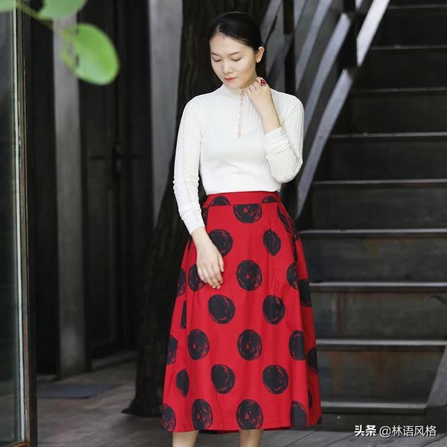 大红圆圈印花半裙,搭配白色上衣,整体风格亮丽清新,大红色也不会显得那么夸张。