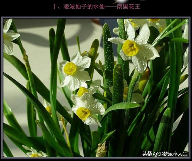 凌波仙子-水仙,水仙:借水开花自一奇,水沉为骨玉为肌。水仙花语:自恋 多情、想你、表示思念、团圆 敬意 孤独。