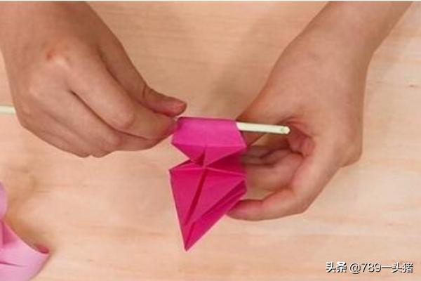 5、在下面剪一个小口,再插入一根花茎,美丽的百合花折纸就折好啦!