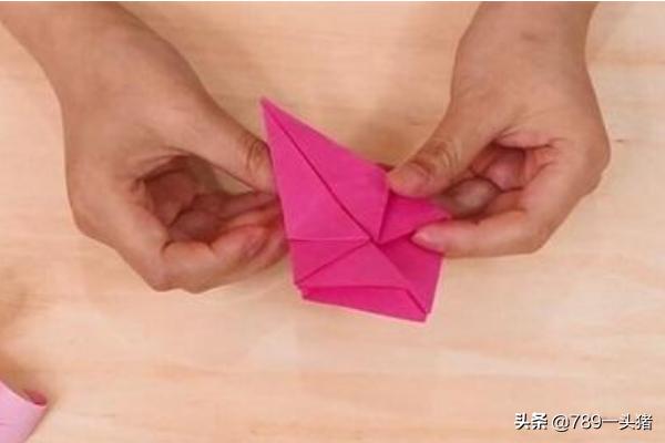 3、然后沿折线往内折叠,并将尖头往内翻开,四边往里面折成三角。