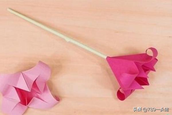 准备一张正方形的折纸,对折两次,收拢成正方形,再将四个角分别往中轴线折,之后往内折叠,将尖头翻开,四边往里面折三角,将尖角卷成花瓣,在下面剪一个小口插入花茎,百合花就折好了。