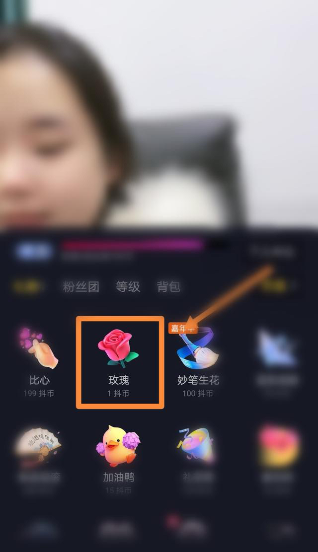 在直播间,直播界面下面有一个礼物盒,点击它,如图会出现很多礼物,找到玫瑰花。