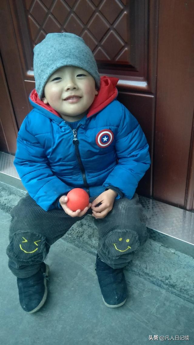 三岁儿子坐门口天真笑脸[呲牙]
