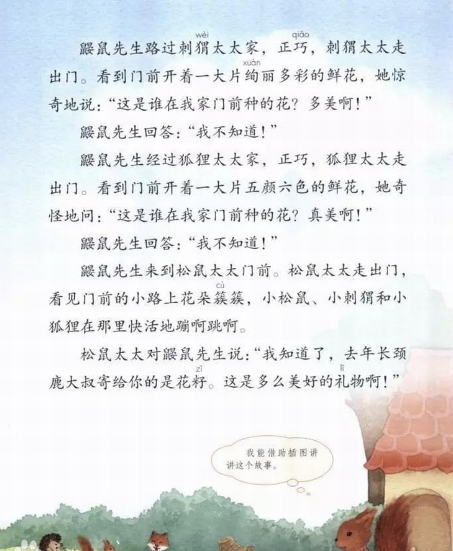 课文讲述的是鼹鼠先生本想向松鼠太太请教长颈鹿大叔寄来的小颗粒是什么,可是却不小心将它们漏在了路上。春天,通往松鼠太太家的路,成了一条开满鲜花的小路。原来,长颈鹿大叔寄来的小颗粒是花籽。花籽,这是一份多么美好的礼物,它给大家带来了快乐与美好。故事让人读来心中充满了温暖。